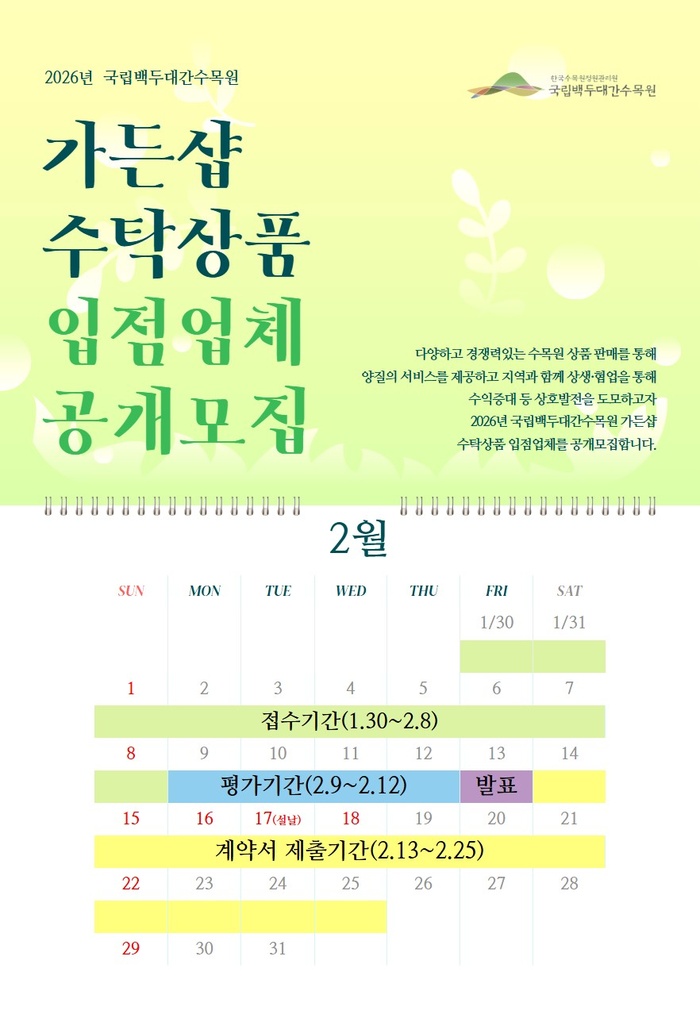 산림청 산하 한국수목원정원관리원(이사장 심상택)은 오는 2월 8일까지 국립백두대간수목원 가든샵 수탁상품 입점업체를 공개 모집한다고 밝혔다.