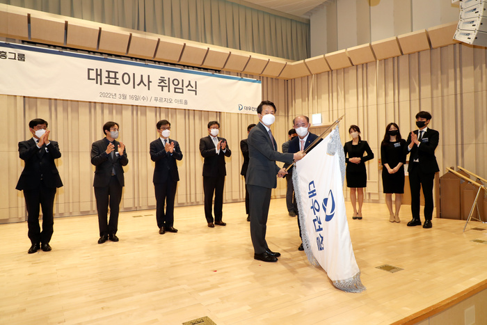 | 고 정창선 중흥그룹 회장이 지난 2022년 대우건설 대표로 취임하면서 대우건설기를 넘겨받고 있다. 사진 / 대우건설 제공 |