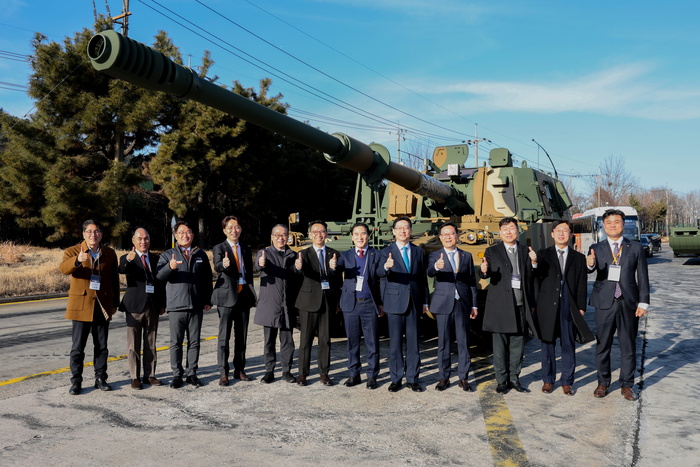 | (왼쪽 다섯번째부터) 정인섭 한화에어로스페이스 상생협력실장, 김명주 경상남도 경제부지사, 김종양 국민의힘 국회의원, 김경수 대통령직속 지방시대위원장, 손재일 한화에어로스페이스 대표, 조정현 상생협력협의회 대표(SG솔루션 회장) 등이 경남 창원특례시 한화에어로스페이스 3사업장에서 열린 '방산ㆍ항공우주산업 혁신을 위한 상생협력 선포식' 이후 K9 자주포 앞에서 기념촬영하고 있다 / 한화에어로스페이스 제공 |