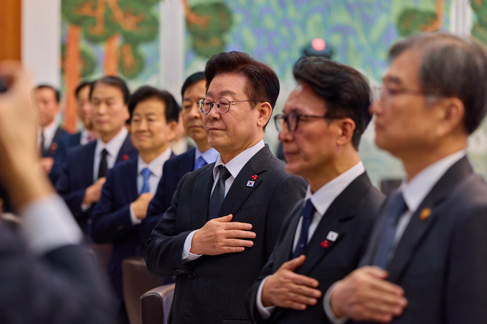 | 이재명 대통령과 국무위원들이 국무회의에 앞서 국기에 대한 경례를 하고 있다. [청와대 제공] |