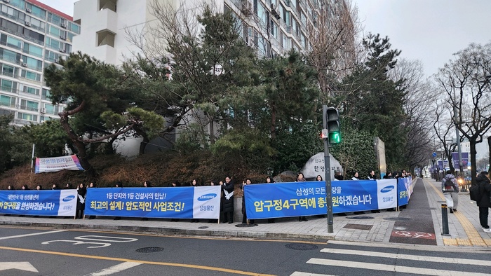 공동 도급(컨소시엄)이 불가한 데다 대규모에 한강변 최고 입지로 건설업계에 상징성이 큰 단지인 만큼 시공권을 쥐려는 업체 간 신경전도 치열하다. 삼성물산 건설부문은 이날 주택영업본부장을 비롯해 주요 실무진 200여명이 도열해 주민들에게 지지를 호소했다. 앞서 삼성물산은 압구정재건축전담팀을 꾸리고 지난해 5월 압구정 현대아파트 인근에 프라이빗 라운지 압구정 S.라운지를 열었다.