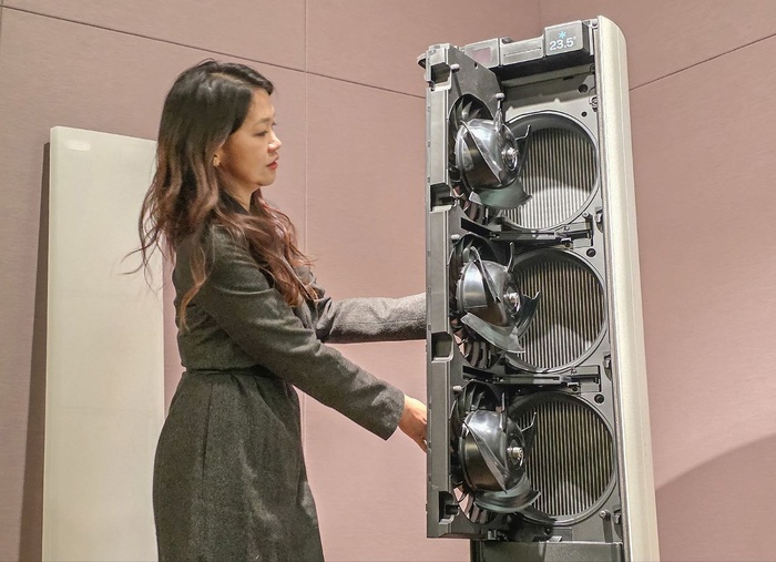 | 삼성전자 직원이 서울 서초구 우면동에 위치한 삼성전자 서울 R&D 캠퍼스에서 비스포크 AI 무풍콤보 갤러리 프로 에어컨의 전면 매탈 패널과 내부 팬까지 손쉽게 분리해 청소할 수 있도록 돕는 이지오픈패널과 이지오픈도어를 시연하고 있다./사진:삼성전자 |
