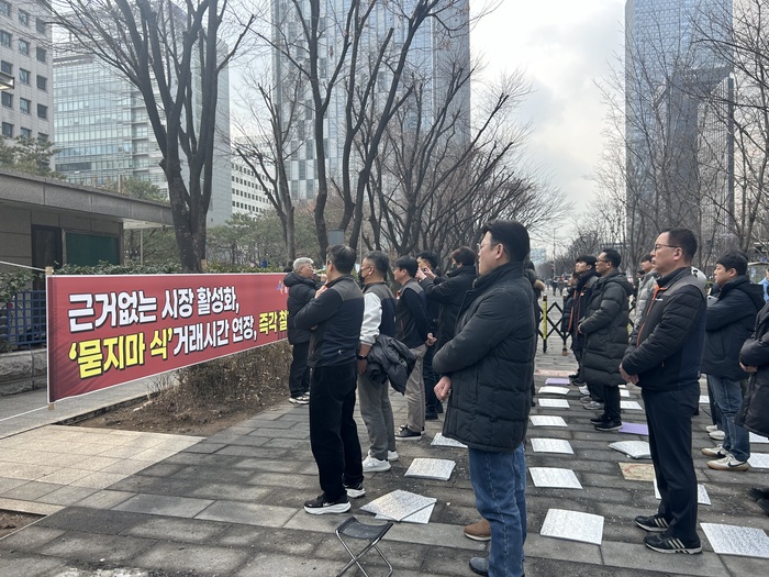 | 정은보 한국거래소 이사장의 신년 기자간담회가 열린 5일 오후 서울 여의도 한국거래소 사옥 앞에서 증권노조가 거래 시간 연장 반대 시위를 열었다. / 사진=김관주 기자 |