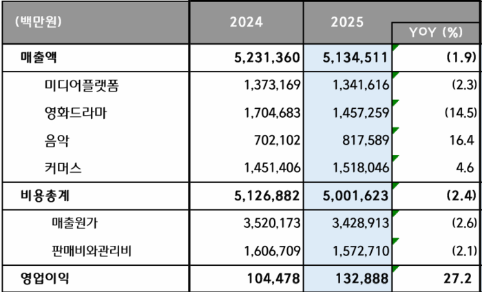 CJ ENM은 연결 기준 2025년 영업이익 1329억원으로 전년 동기 대비 27.2% 증가했다고 5일 공시했다. 시장 추정치(948억원)을 크게 웃도는 실적이다. 같은 기간 매출은 5조1345억원으로 1.9% 감소했다.