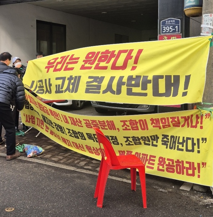 | 5일 경기 성남시 상대원2구역 재개발 사업 일부 조합원들이 조합사무실 앞에 신규 시공사 선정 절차 중단을 촉구하는 현수막을 걸고 있다. / 사진 : 독자제공 |