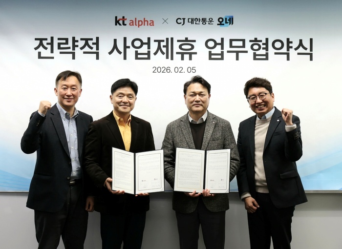 | (왼쪽부터) KT알파 쇼핑 조태종 T커머스지원본부장 및 이정호 T커머스사업부문장, CJ대한통운 윤재승 오네(O-NE) 본부장 및 강원석 오네(O-NE) 남서울사업담당. /사진: KT알파 쇼핑 제공 |