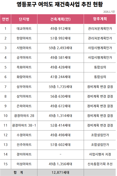 6일 영등포구(구청장 최호권)에 따르면 현재 여의도에서 추진 중인 정비사업은 총 15곳이다. 이들 사업장은 여의도 전역에서 재건축 진단부터 관리처분계획인가 준비에 이르기까지 각기 다른 속도로 동시에 움직이고 있다.