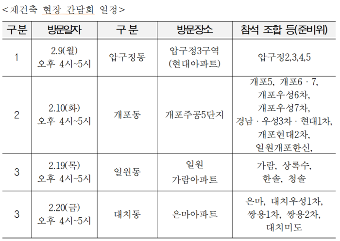 조성명 강남구청장은 “재건축은 주민 삶과 직결된 만큼 현장에서 구민들과 직접 만나 소통하며, 필요한 지원을 신속히 뒷받침 하겠다”며 “단지별 사업 단계에 맞춘 지원으로 재건축이 차질 없이 진행되도록 끝까지 챙기겠다”고 말했다.