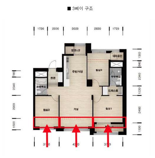 | 공동주택의 3베이 평면도(홈앤홈 홈페이지 참조) |