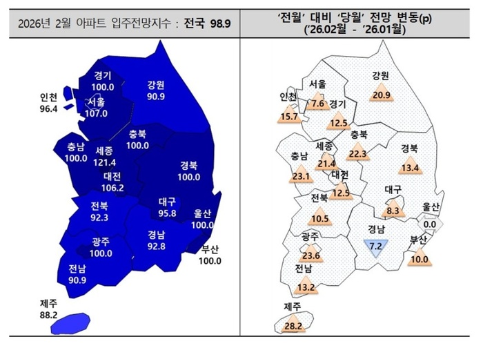 서울(107.6)이 7.6포인트, 인천(96.4)은 15.7포인트, 경기(100.0)는 12.5포인트 각각 올라 수도권 전체(101.3)로는 11.9포인트 상승 전망됐다.
