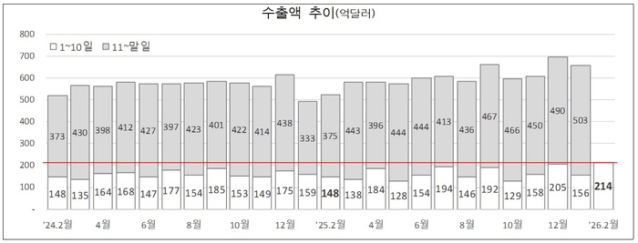 11일 관세청에 따르면, 이달 1~10일 수출액은 214억달러로 지난해 같은 기간보다 44.4% 증가했다.