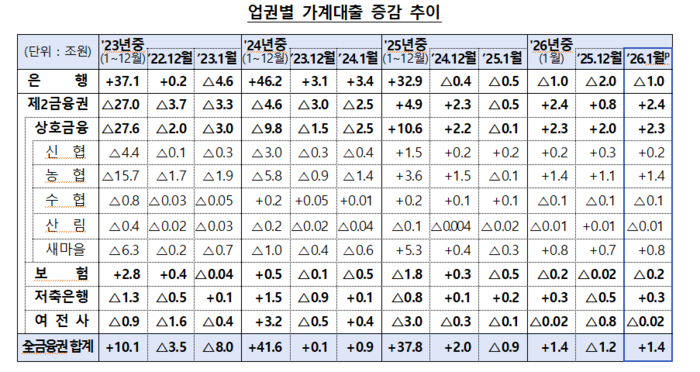 11일 금융당국이 발표한 ‘2026년 1월 가계대출 동향(잠정)’에 따르면 지난달 전 금융권 가계대출은 전월 대비 1조4000억원 증가했다. 지난해 12월 1조2000억원 감소한 이후 한 달 만에 증가세로 돌아섰다.