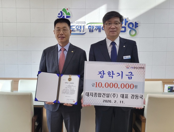 [대한경제=박경남 기자] 강동국 대지종합건설㈜ 대표(왼쪽)는 최근 경남 함양군을 방문해 함양군장학회에 장학금 1000만원을 전달했다.