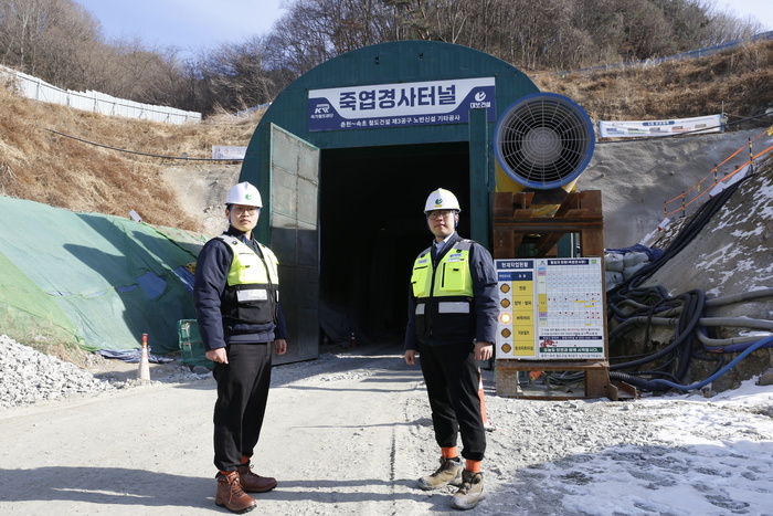| 대보그룹 공채 15기 형 이기범 사원(오른쪽)과 공채 17기 동생 이관우 사원이 춘천-속초 철도건설 현장에서 기념촬영을 하고 있다. / 사진: 대보건설 제공. |
