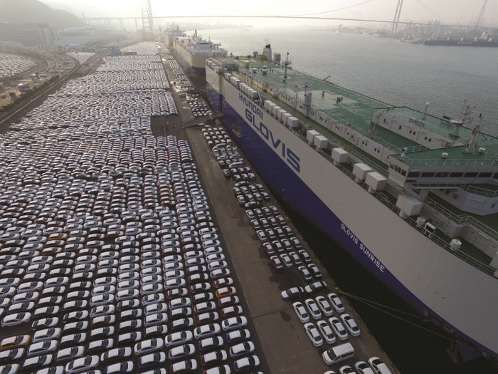 | 현대글로비스의 자동차운반선과 선적을 기다리고 있는 차량들./사진: 현대글로비스 제공 |