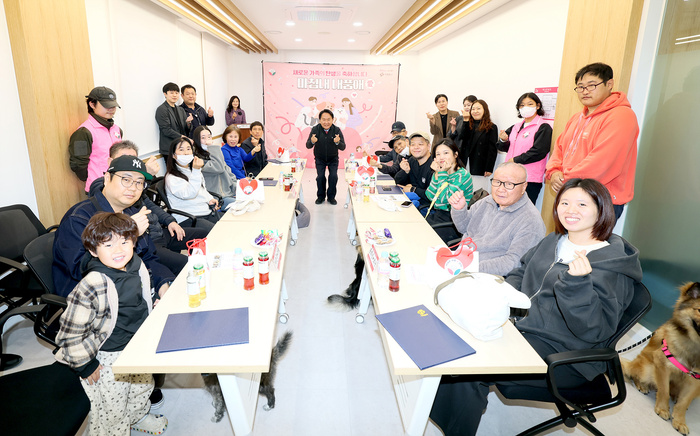 | 지난해 11월 서대문 내품애(愛)센터에서 열린 유실·유기동물 입양식에서 이성헌 서대문구청장(가운데)과 관계 주민 및 직원들이 기념 촬영을 하고 있다. / 사진 : 서대문구 제공 |