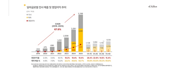달바글로벌은 연결 기준 지난해 매출이 5198억원으로 전년보다 68% 증가했다고 20일 잠정 공시했다. 영업이익은 69% 늘어난 1011억원을 기록했다.
