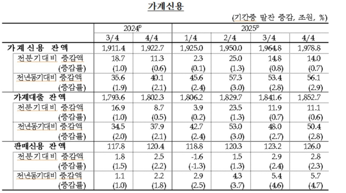20일 한국은행이 발표한 ‘2025년 4분기 가계신용(잠정)’에 따르면 지난해 12월 말 기준 가계신용 잔액은 1978조8000억원으로 집계됐다. 전분기보다 14조원 늘었으며 증가 폭은 직전 분기(14조8000억원)보다 소폭 축소됐다. 전기 대비 증가율은 0.7%로 나타났다.