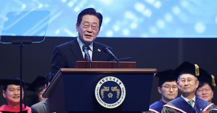 | 이재명 대통령이 20일 대전 유성구 한국과학기술원(KAIST)에서 열린 학위수여식에서 축사하고 있다./사진:연합뉴스 |