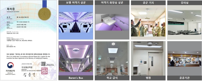 | 사진: 여객기 객실과 화장실에 적용된 욕실용 살균 조명 시스템과 특허증. /사진:새턴바스 제공 |