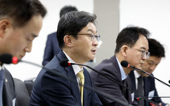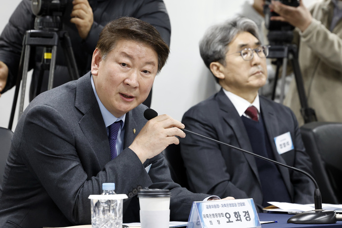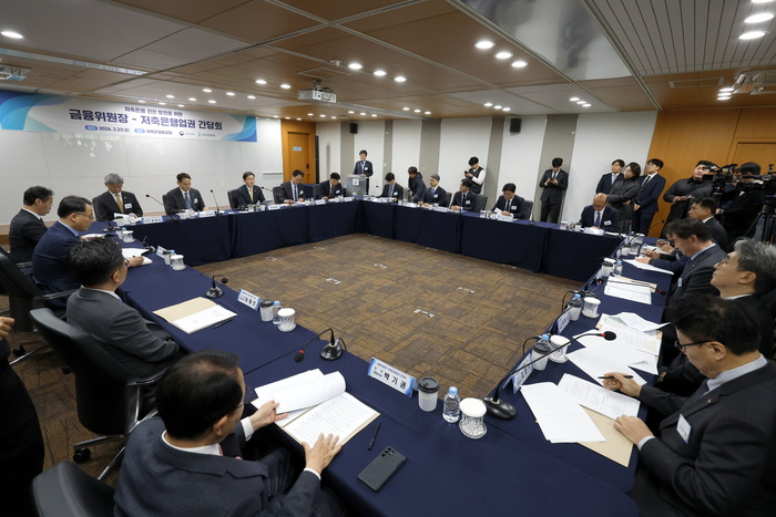 이억원 금융위원장이 23일 오후 서울 저축은행중앙회에서 열린 저축은행 CEO 간담회에 참석해 오화경 저축은행중앙회 회장 등 12개 저축은행 대표들과 기념촬영을 하고 있다.