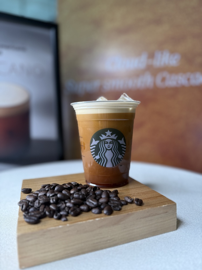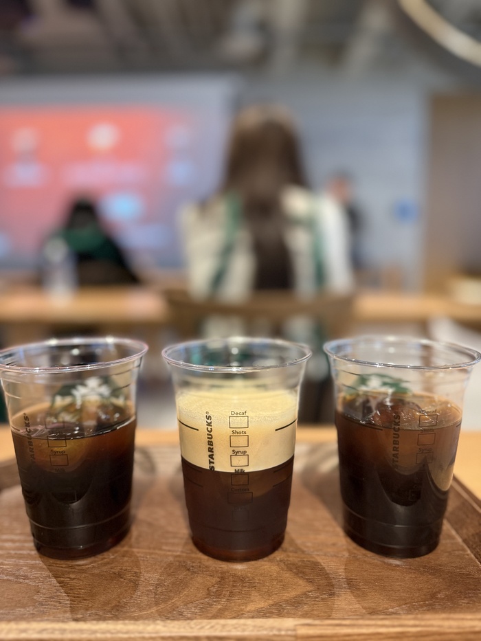 이렇게 만들어진 공기 거품을 아이스 아메리카노 전용 컵에 기울여 담으면, 뜨거운 거품과 차가운 얼음이 만나 ‘캐스케이딩’ 현상이 시작된다. 거품이 폭포처럼 아래로 흘러내리며 아메리카노와 자연스럽게 분리되는 이 과정이 투명한 컵 너머로 고스란히 펼쳐진다. 음료가 완성되는 캐스케이딩 장면은 그 자체로 콘텐츠가 됐다. 숏폼 동영상과 SNS로 소비 경험을 공유하는 지금의 트렌드를 겨냥한 설계로 읽혔다. 실제로 이날 행사에 참석한 기자들 대부분이 음료를 받는 즉시 스마트폰 카메라를 들었다.