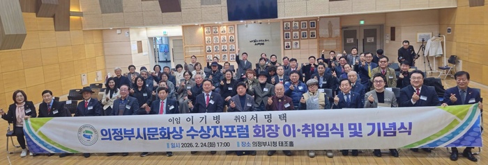 [대한경제=최종복 기자]경기 의정부시 의정부시문화상수상자포럼은 지난 24일 의정부시청 태조홀에서 이기병 이임회장, 서명택 신임회장, 김연균 의정부시의회의장, 회원 등이 참석한 가운데 회장 이·취임식을 개최했다.