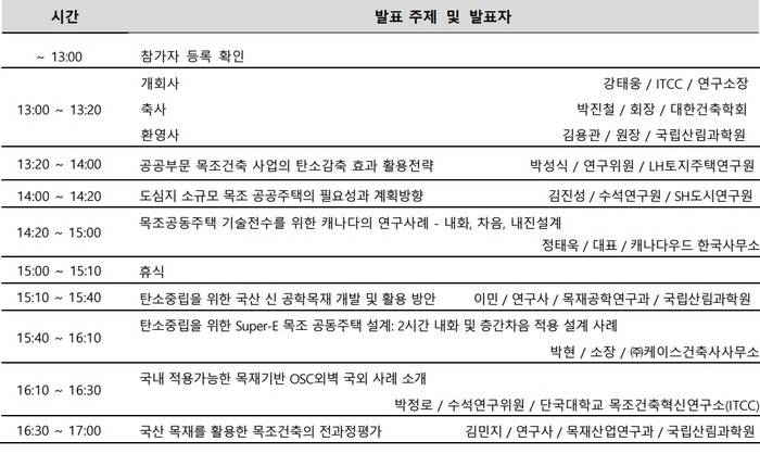 ITCCㆍLH토지주택연구원ㆍ대한건축학회ㆍ국립산림과학원 등이 공동 주최하는 행사는 다층 목조 공동주택의 정책적 활용 가능성과 공공부문 적용을 위한 제도ㆍ기술적 방향을 논의하고자 마련됐다. 행사에서는 △공공부문 목조건축 사업의 탄소감축 효과 활용전략(박성식 LH토지주택연구원 연구위원) △도심지 소규모 목조 공공주택의 필요성과 계획방향(김진성 SH도시연구원 수석연구원) 등이 발표된다.