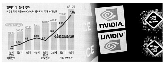 무엇보다 시장을 안심시킨 것은 향후 예상 ‘가이던스’다. 회사는 2~4월 분기 매출을 780억달러로 제시했다. 월가 컨센서스(726억달러)를 크게 상회한다. 실적의 대부분은 데이터센터(623억달러)에서 나왔다. AI 인프라 투자가 여전히 현재진행형임을 수치로 증명한 셈이다.