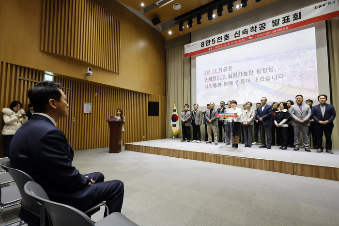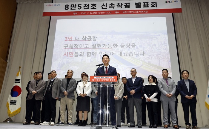 오세훈 서울시장이 26일 오전 서울시청에서 열린 '8만5000가구 신속착공 발표회'에 참석해 서울시 정비사업 추진 정상화 방안을 발표하고 있다.