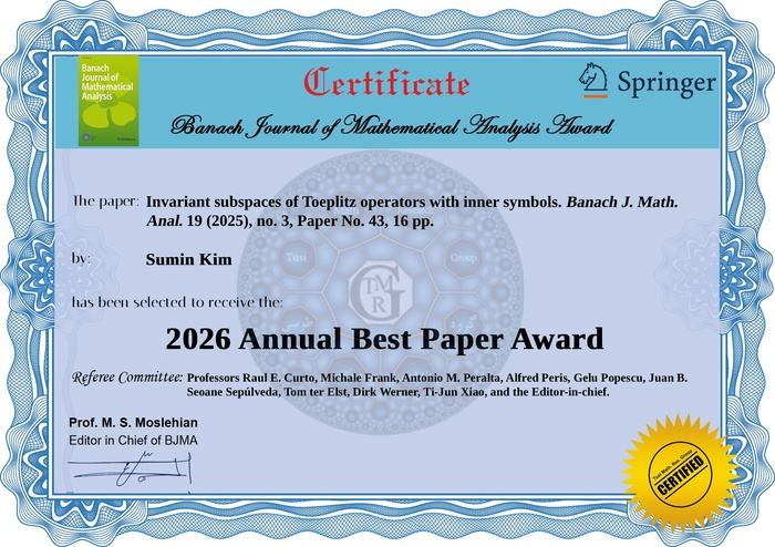 Banach Journal of Mathematical Analysis는 해석학 분야에서 높은 평가를 받는 SCI 등재 국제학술지로, 최근 2년간 게재된 논문을 대상으로 매년 단 1편의 최고 논문을 선정해 Best Paper Award를 수여한다.