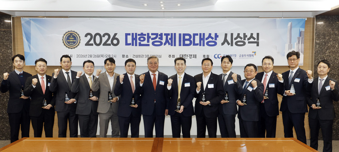 26일 서울 강남구 건설회관에서 열린 ‘2025 대한경제 IB대상’ 시상식에서 유일동 대한경제신문 사장과 자본시장 발전에 기여한 12개사 수상자들이 기념촬영을 하고 있다. 종합대상의 영예는 KB국민은행에 돌아갔다.
