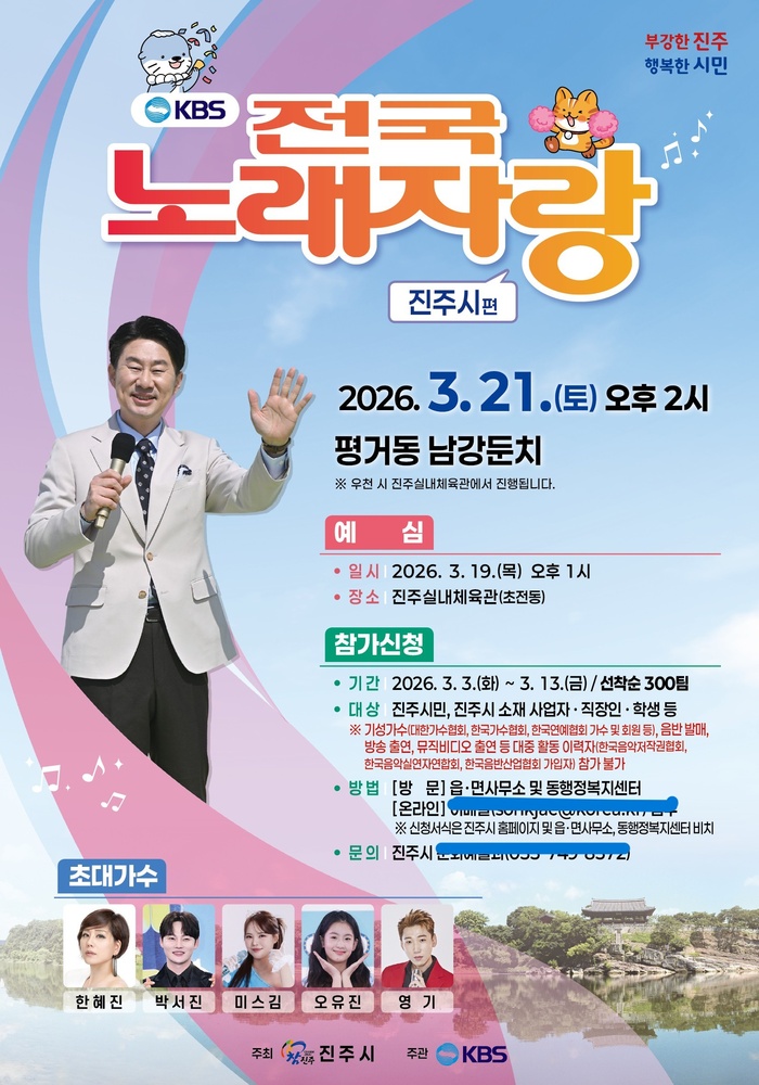 진주시는 오는 3월 21일 토요일 오후 2시, 평거동 남강 둔치에서 ‘KBS 전국노래자랑 진주시 편’을 개최한다고 26일 밝혔다.