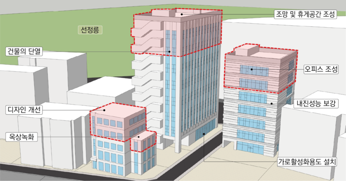 규제 완화와 인센티브는 항목 이행 수준과 배점 기준에 따라 결정된다. 인센티브는 ‘건축물 성능을 끌어올리면서도 실현 가능한 항목’에 맞춰 설계됐다고 구는 설명했다. △디자인 개선 △건물녹화 △구조안전ㆍ내진성능 평가 및 보강 △단열ㆍ에너지 성능 향상 △공개공지 개선과 실내형 공개공간 조성 △1층 가로활성화 용도 지정 △로비 위치 변경을 통한 1층 공공개방공간 조성 △부설주차장 개방ㆍ공유주차, 전기차 충전 등 주차 개선 △스마트산업 육성을 위한 시설 조성 △범죄예방(CPTED) 적용 △화재안전 성능 보강과 침수 대비 △보행환경 개선 등이 주요 적용 항목이다.