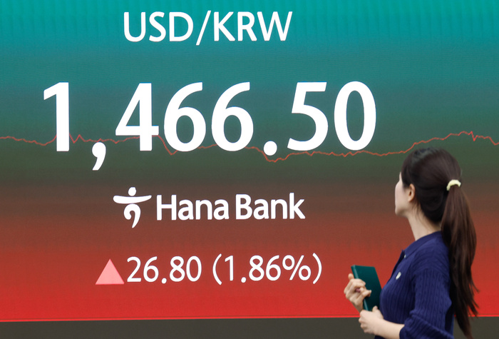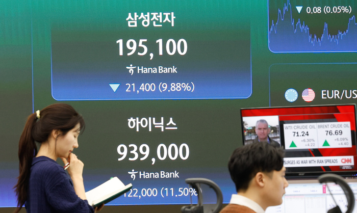 코스피가 미국과 이란의 전쟁 충격으로 7% 넘게 폭락하면서 5800선 아래로 내려앉은 3일 서울 중구 하나은행 본점 딜링룸에 종가 지수가 표시되고 있다.