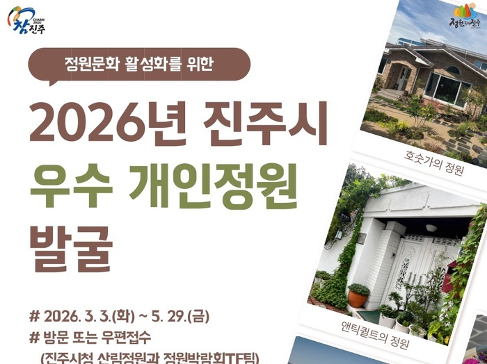 진주시는 시민이 조성·관리하는 우수 개인정원을 발굴하고 정원문화 확산과 관광자원화를 도모하기 위해 ‘2026년 진주시 우수 개인정원’을 모집한다고 3일 밝혔다.