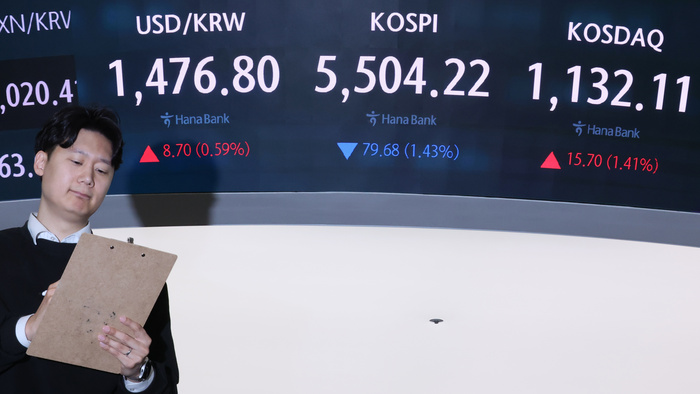 | 6일 서울 중구 하나은행 본점 딜링룸 현황판에 원/달러 환율, 코스피, 코스닥 지수가 표시돼 있다. / 사진=연합 제공 |