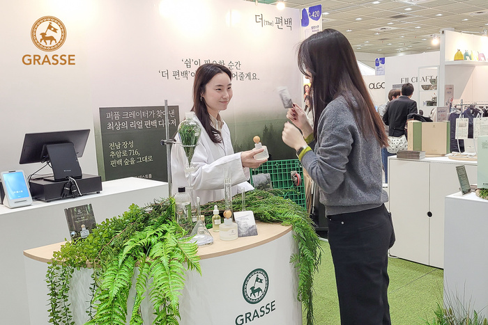 부스에는 편백 오일 추출을 형상화한 조형물을 배치하고, 달항아리ㆍ디퓨저ㆍ차량용 방향제 등을 직접 시향할 수 있는 향 체험존도 마련했다. 치유의 숲 주소에서 착안한 스톱워치 이벤트도 참관객 호응을 얻었다.