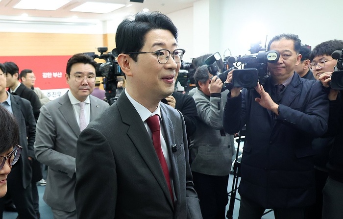 | 주진우 국민의힘 의원이 9일 오전 부산 연제구 부산시의회에서 부산시장 출마 선언을 한 뒤 기자회견장을 나서고 있다./사진:연합뉴스 |