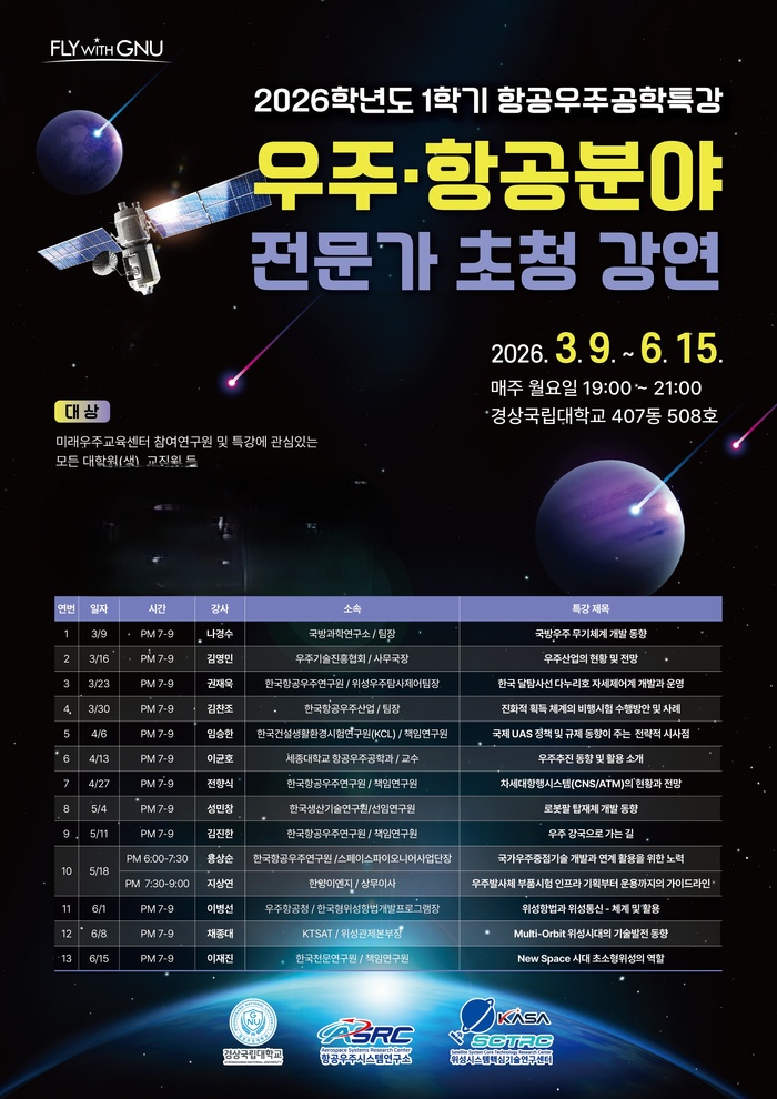 | 경상국립대학교(GNU·총장 권진회) 위성시스템핵심기술연구센터(센터장 박재현)는 9일부터 오는 6월 15일까지 13차례에 걸쳐 우주‧항공 분야 전문가 초청강연을 진행한다. / 사진 : 경상국립대학교 제공 |