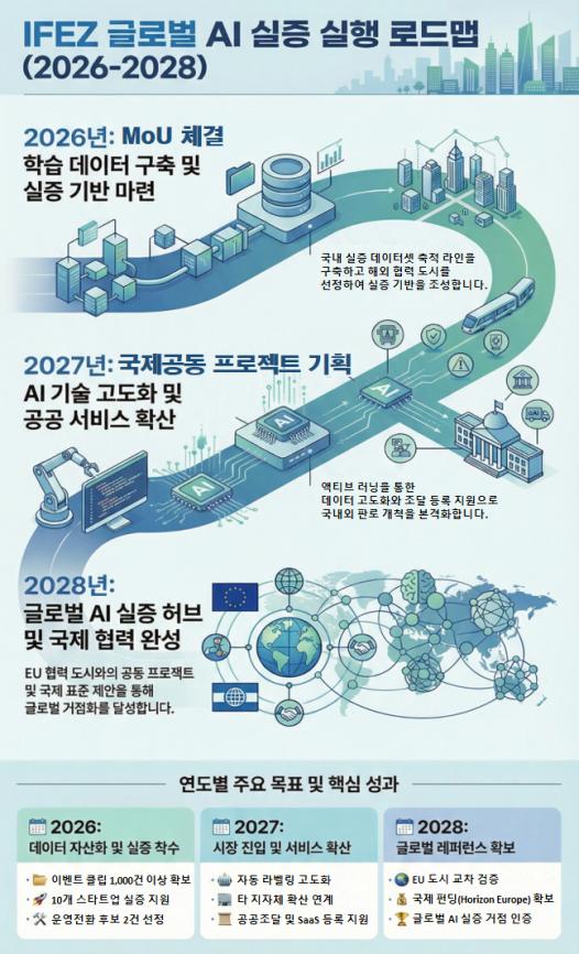 이는 ‘도시가 데이터를 제공하고, 기업이 기술을 고도화하며, 공공이 검증된 AI를 구매하는 구조’를 국제적으로 확산하는 시도다. IFEZ는 2026년 실행형 업무협약(MoU) 체결을 시작으로 2027년 국제 공동 파일럿 기획, 2028년 국제 공동 실증 및 글로벌 AI 실증 허브 구축으로 이어지는 단계적 로드맵을 추진할 계획이다.