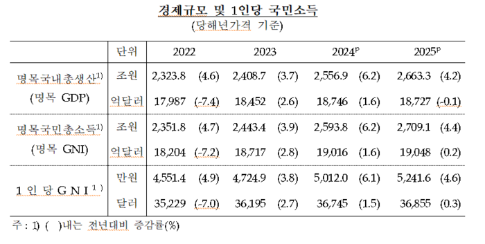 원화 기준으로는 5241만6000원으로, 작년(5012만원)보다 4.6% 늘었다. 명목 GDP도 원화 기준 2663조3000억원으로 4.2% 증가했다.