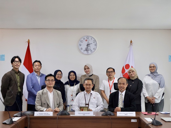 | 지난달 23일 인도네시아 자카르타에 위치한 인도네시아 국가연구혁신청(BRIN)에서 정민경 코스맥스인도네시아 법인장(앞줄 왼쪽)과 물야디 시눈 하르조노(Mulyadi Sinung Harjono) BRIN 산업 연구 및 혁신 활용 국장(앞줄 가운데), 수나르노(Sunarno) BRIN 생물 의학 연구 센터장(앞줄 오른쪽) 등 관계자들이 협약 체결 후 기념촬영을 하고 있다./사진=코스맥스 |