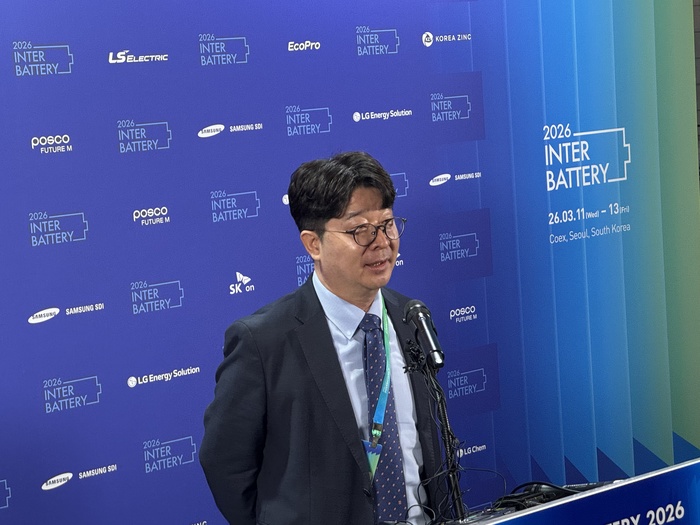 | 11일 서울 코엑스에서 열린 ‘인터배터리 2026’ 현장에서 엄기천 한국배터리산업협회장이 기자들의 질문에 답하고 있다. /사진: 이계풍 기자 |