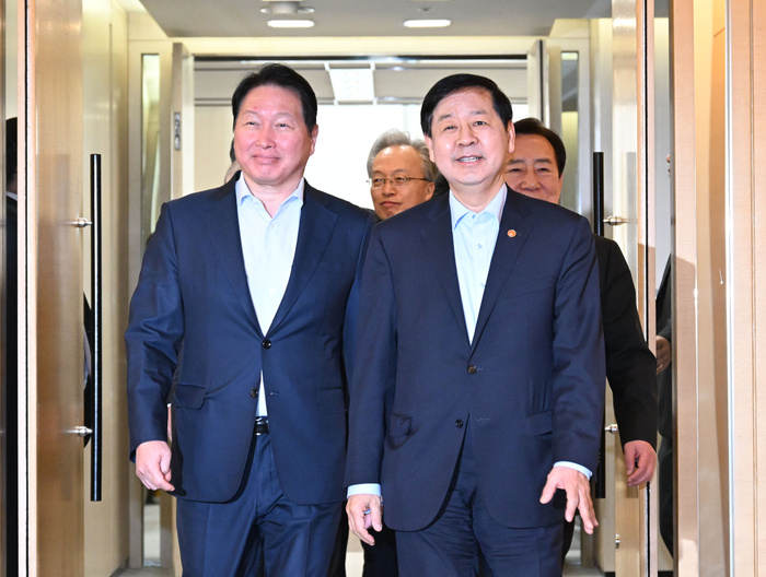 | 구윤철 부총리 겸 재정경제부 장관(사진 오른쪽)과 최태원 최태원 대한상공회의소 회장이 12일 서울 중구 대한상공회의소에서 열린 ‘기업혁신 지원 민관협의체 킥오프 회의’에 참석하고 있다. / 사진: 재정경제부 |