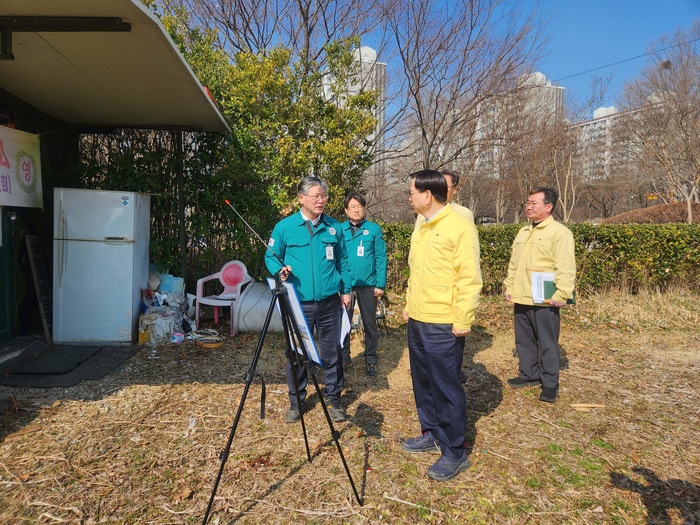 | 지난 10일 고광완 광주광역시 행정부시장과 광산구 관계자들이 영산강·황룡강 하천구역을 찾아 무단 점용된 불법 시설물 정비 추진상황을 꼼꼼하게 점검하고 있다. / 사진: 광산구 제공 |