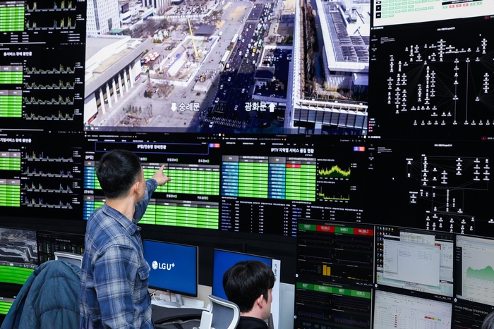 | LG유플러스 직원들이 마곡사옥 내 통합관제센터에서 광화문 광장 인근 지역 교통상황과 네트워크 품질을 살피고 있다. /사진: LG유플러스 제공 |
