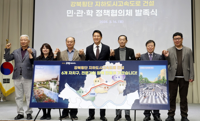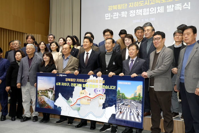 16일 오전 서울시청에서 열린 '강북횡단 지하도시고속도로 민·관·학 정책협의체' 발족식에서 오세훈 서울시장과 6개 자치구 주민대표, 분야별 전문가가 기념촬영을 하고 있다.