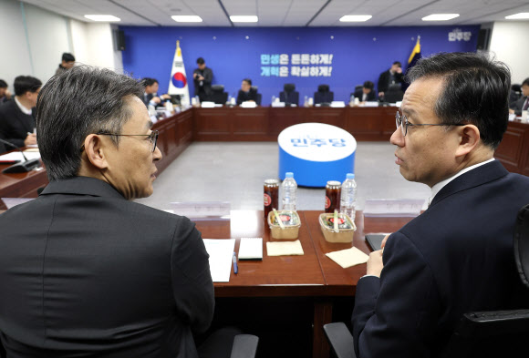 | 이형일 재정경제부 1차관(오른쪽)과 권대영 금융위원회 부위원장이 16일 국회 의원회관에서 열린 더불어민주당 중동사태 경제 대응 TF 2차 회의에서 얘기를 나누고 있다./사진:연합 |
