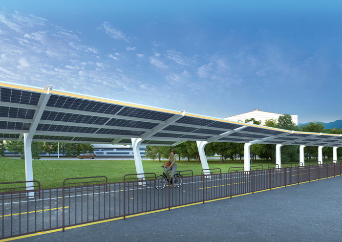 ‘경기 햇빛 자전거길’ 사업은 자전거길 상부 유휴공간에 태양광 발전시설을 설치하고 시민 편의시설을 결합한 재생에너지 인프라 조성 사업으로, 정왕동 시화방조제 자전거길 초입에 약 761.6kW 규모의 시설이 설치됐다.